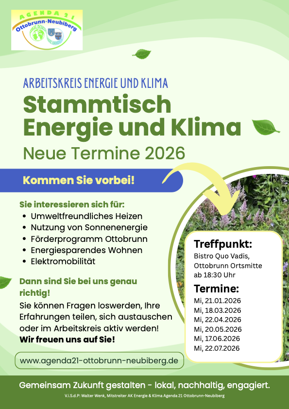 Am Mittwoch, den 29.10.2025 findet ab 18.00 Uhr der nächste Energie-Stammtisch statt. Treffpunkt ist im Herz & Seele, Ortsmitte von Ottobrunn. Wir freuen uns über jede Teilnahme.